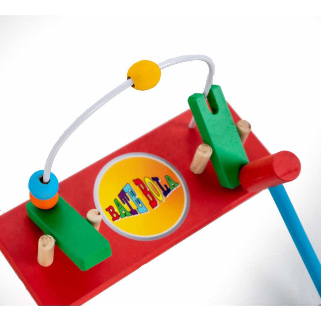 O bate bola é composto por um aro com bolas que se movem à medida em que a criança bate com o martelo na base. As crianças ficarão fascinadas ao verem as bolinhas se movimentarem pelo arco do aramado. Estimula a coordenação viso-motora, audição, ordem, cor, quantidade e controle de força.