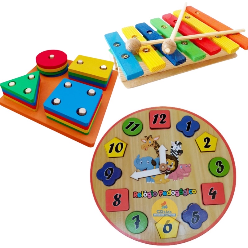 - RELÓGIO PEDAGÓGICO - O Relógio Pedagógico estimula o aprendizado das horas, a identificação das formas geométricas, o aprendizado das cores e o desenvolvimento da coordenação motora fina. O Relógio é um jogo de encaixar peças de madeira perfeito para as crianças se divertirem aprendendo as horas, além de ser lindo, colorido, um brinquedo lúdico e criativo. É um relógio de palhacinho com 12 peças para encaixe em cores e formatos geométricos diversos e numeradas de 1 a 12.