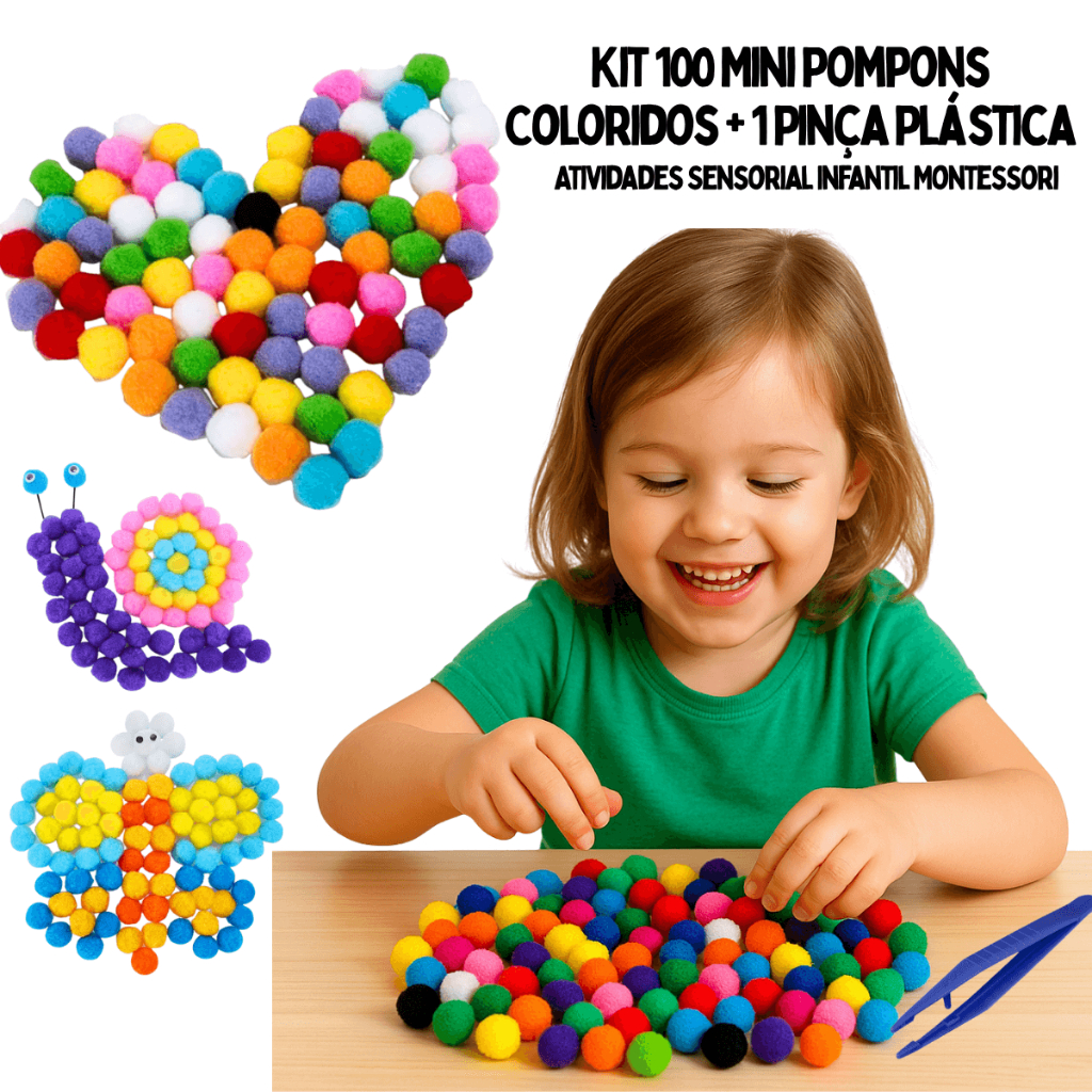 Os mini pompons são macios, leves e em cores vibrantes que despertam a curiosidade e o foco das crianças. Ideal para exercícios de pinça, separação por cor e muito mais!