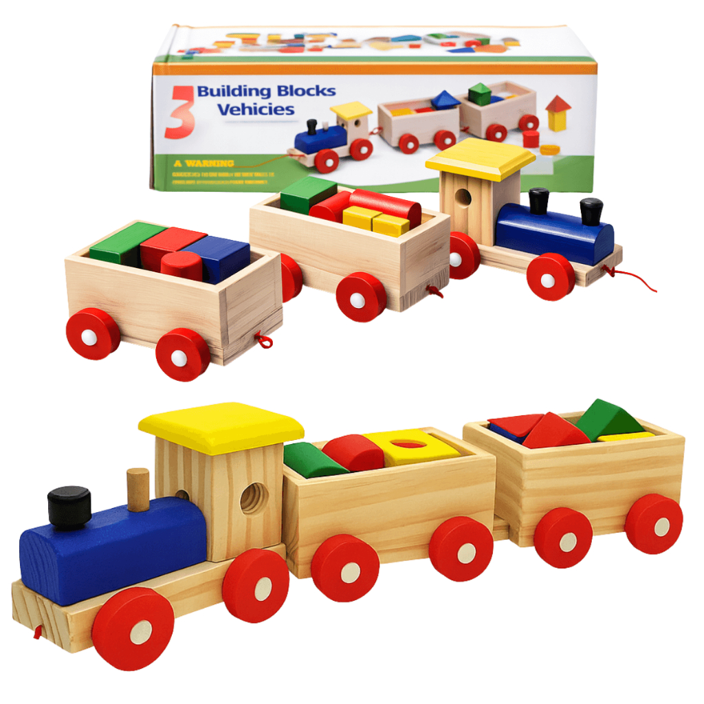 As crianças podem montar, empilhar, construir e guardar os bloquinhos dentro dos vagões, promovendo um brincar criativo e organizado.